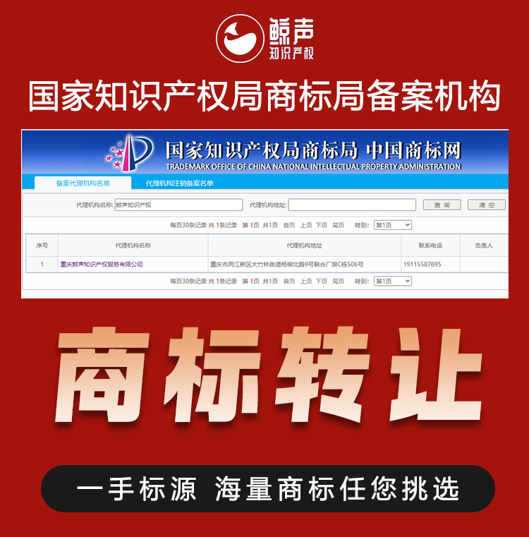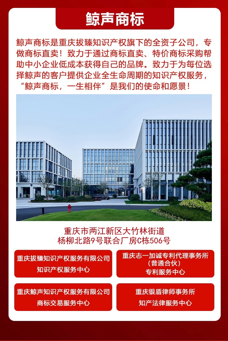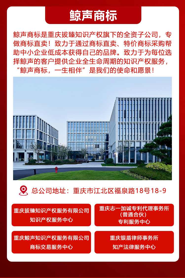 重庆鲸声知识产权服务有限公司是一家主做商标直卖、商标注册的综合性知识产权服务公司!致力于通过商标直卖、特价商标采购、零风险商标注册,帮助中小企业低成本获得自己的品牌。致力于为每一位选择鲸声的客户提供企业全生命周期的知识产权服务。 “鲸声商标,一生相伴”是我们的使命和愿景! 鲸声商标期待与您得合作!